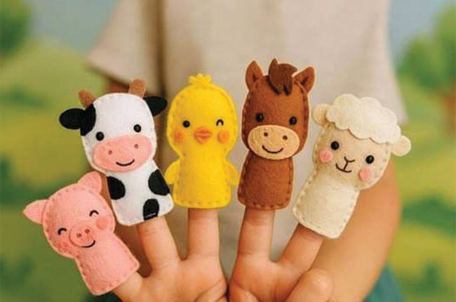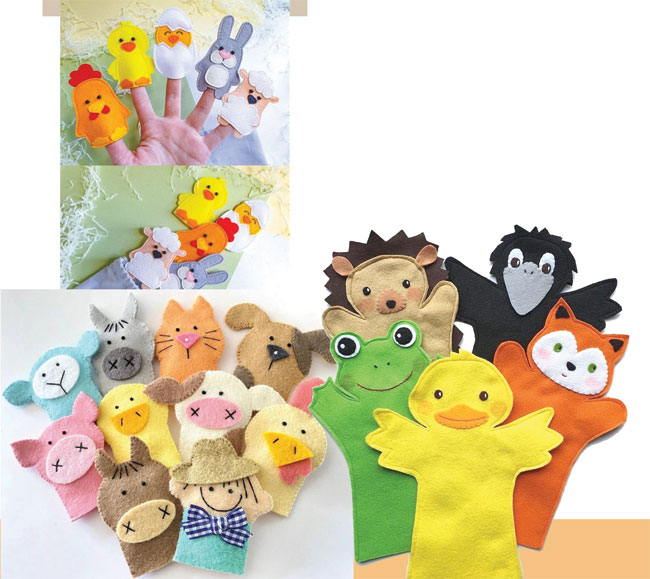 පළමුව කඩදාසි කොළයක් ගෙන රූප සටහනේ පරිදි සතාගේ මුහුණ ඇඳ ගන්න. ඉන්පසු යට කොටසත් ඇඳ ගන්න. මුහුණ සහ ඇඟෙහි සතාගේ පෙනුමට ගැළපෙන ආකාරයටම ඇස් කන් සියල්ලම ඇඳ බ්ලොක් කපා ගන්න. ඇඟිල්ලට දමා ගන්නා රෙදි කොටස සඳහා දිග අඟල් 3 .5 පමණ කොටුවක් කොටස් දෙකකට කපා ගන්න. ඉන්පසු පතරොම්වලට අනුව පොලියෙස්ටර් ෆෙල්ට් රෙද්දෙන් මුහුණු කොටස් දෙකක් කපා ගන්න. ඇඟ කොටස් දෙකක් ද කපා ගන්න. ඇඟ කොටස වටේට බ්ලැන්කට් මැස්මෙන් මසාගෙන ගොස්, ඇඟිල්ල දමා ගන්නා කොටස ඉතිරි කර ගන්න. පසුව කපාගත්, සතාගේ මුහුණු කොටස් දෙක එකට තබා වටේට බ්ලැන්කට් මැස්මෙන් මසා ගෙන පැඩින් පුරවා ගන්න. ෆ්ලීස් රෙද්දෙන් කපා ගත් කන් දෙක මුහුණ දෙපසින් අලවා ගන්න. ඇස් තිබෙන තැන් ලකුණු කර එවාටත් ෆ්ලීස් රෙද්දෙන් කළු පාටින් ඇස් කපා ගන්න. නහය, කට සියල්ලක්ම රෙදිවලින්ම කපා ගන්න. මුහුණේ ඇස් කන් නහය අලවා පළමුව සාදා ගත් ඇඟ කොටසට සත්ත්ව මුහුණ අලවා ගන්න. මේ විදිහට වර්ග කිහිපයකින් සත්ත්ව රූප සකසා ඇඟිලිවල දමා පෙන්වමින් පුංචි බබාව විනෝදයෙන් තියන්න.