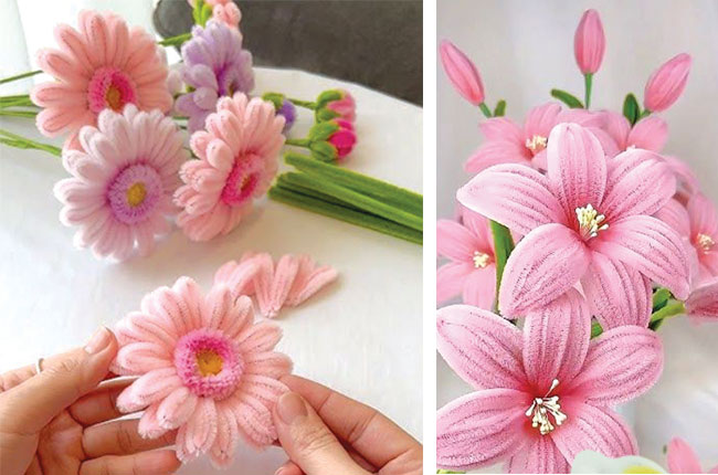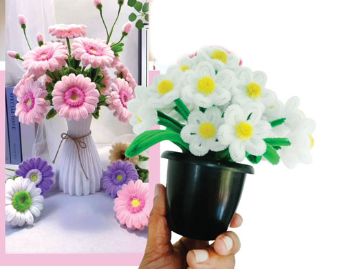 මේ නිර්මාණය මඟින් දියණියගේ පොත් මේසය හැඩ කරන්න, ආලින්දයේ රටා මවන්න හරි අපූරුයි. ඔබේ නිර්මාණශීලිත්වය අනුව පයිප් ක්ලීනර් මල් විතරක්ම නොවෙයි වෙනත් නිර්මාණත් කළ හැකියි.