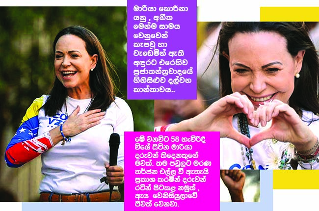 මෙවර නොබෙල් සාම ත්යාගය හිමිවන්නේ වෙනිසියුලා විපක්ෂ නායිකා මාරියා කොරීනා මචාඩෝ වෙත බව නොබෙල් කමිටුව නිවේදනය කර තිබෙනවා. “වෙනිසියුලාවේ යකඩ ගැහැනිය” යනුවෙන් ප්රකට ඇය මේ ආරංචිය ලද විගස ඊට ප්රතිචාර දක්වා තිබුණේ ,” මට මේක හිතාගන්නවත් බෑ..සතුට වැඩිකමටම මට ඇතිවුණේ තිගැස්මක්…” යනුවෙන්.