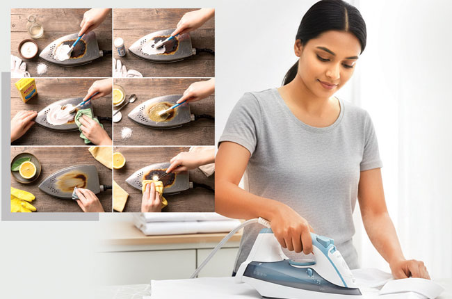 1. බේකිං සෝඩා ස්වල්පයක් වතුර සමඟ මිශ්ර කර කුඩා පල්පයක් සකසා ගන්න. එය අයන් එකේ පිලිස්සුම් පැල්ලම්වල තවරන්න. පසුව අයන් එක විදුලියට සම්බන්ධ කර, රත් කර කපු රෙදි කැබැල්ලකින් පිසදා හරින්න.