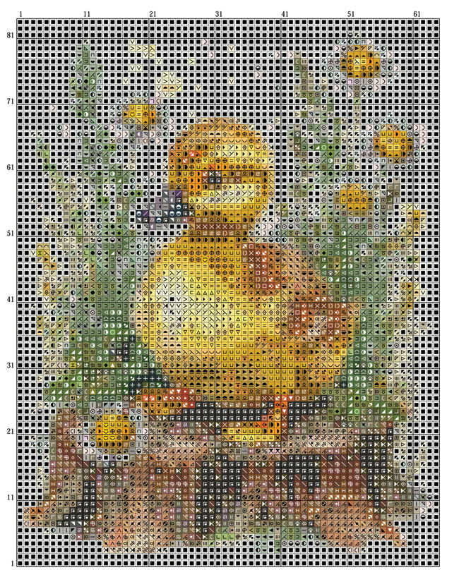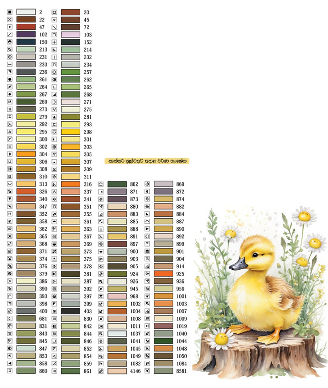 මෙම නිර්මාණය අඟල් 4.7 x 6.0 ප්රමාණයේ නිර්මාණයකි. එහෙත් ඔබට කැමැති ප්රමාණයට සකසා ගත හැකියි. ඔබ අඟලට කොටු 14ක් ඇති අයිඩා රෙද්ද භාවිත කරන්නේ නම් හෝ අඟලට කොටු දහයක් හෝ 11ක් ඇති රෙදි භාවිත කරන්නේ නම් නිර්මාණයේ ප්රමාණය තව විශාල වේ. ඒ නිසා රෙද්දේ ඇති අඟලට කොටු ප්රමාණය අනුව නිර්මාණයේ ප්රමාණය වෙනස් වේ. කෙසේ වෙතත් නිර්මාණය රාමුකර ගැනීමට අවශ්ය ලෙස ඉඩ තබා රෙදි කොටස කපාගත යුතුයි. ඒ සඳහා වටේට අඟල් 2ක් හෝ 3ක් ඉඩ තබා රෙදි කොටස කපාගන්න. නැත්නම් නිර්මාණය මැසුවාට පසු රෙදි කොටස කපා ගන්න. කොටු 10න් 10ට නූල් ඇද ගැනීමෙන් මැසීම පහසු වේ. කොටු ගණන් කර මසන්න. නැත්නම් නිර්මාණය හරි මැද සිට මැසීම අරඹන්න. රෙද්දේ අඟලට ඇති කොටු ප්රමාණය අනුව භාවිත කළ යුතු නූල් පොටවල් ප්රමාණය ද වෙනස් වේ. අඟලට කොටු 14ක් නම් නූල් පොටවල් 2ක් සෑහේ. අඟලට කොටු 11ක් නම් නූල් පොටවල් 4ක් හෝ 6ම භාවිත කරන්න.