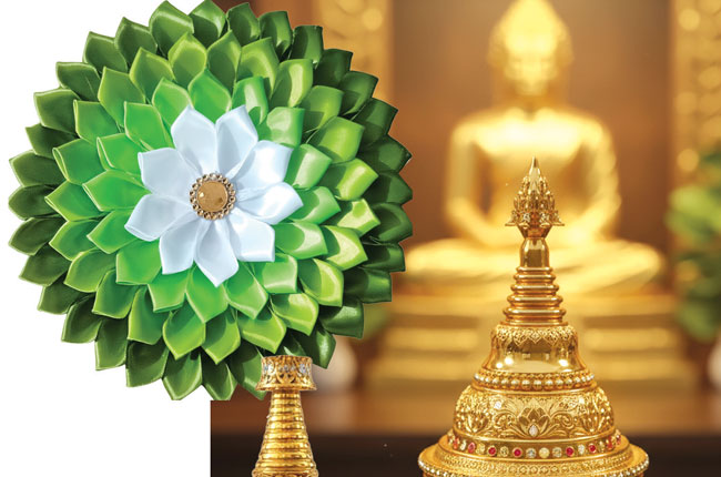 පොල්තෙල් පහන ගෙන කපා ගත් රිබන් පටියක් ගෙන ත්රිකෝණයක් වන සේ මැදින් දෙකට නවා පැති දෙක සහ කොන් දෙක සමානව ගෙන පුච්චා ගන්න. අනතුරුව එක් කොනක් නැවත ඉදිරිපසට නවා පුච්චා ගන්න. පසුව අනෙක් කොනද ඉදිරියට නවා පුච්චාගෙන මල් පෙත්ත සකසා ගන්න.