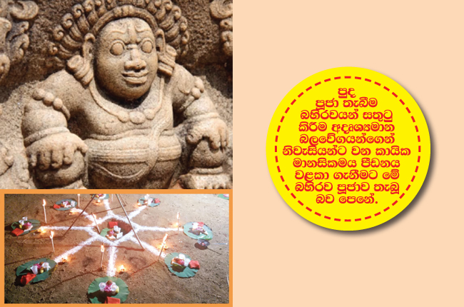 අපි මෙතෙක් කතාබහ කළේ බහිරව දේව සංකල්පය ගැනයි. වර්තමානයේ ද මෙම බහිරව පූජාව පවත්වනු ලැබේ. නිෙවසක් ගොඩනඟන විටදී බහිරව පූජාව තබනු ලැබේ. පැරැණි ගැමියන් එදා කළු ගොනකු ඉඩමට ගොම්මන් සවස් කාලයේ ගෝධූලි මුහුර්තයෙන් සවස 5.03 සිට 7 දක්වා කාලය තුළ ගාල්කර ඉඳිකඩුල්ල වසා දමා ගවයා ළැඟ සිටි තැන උගේ ගොමවලට ඖෂධ වර්ග කලවම් කර එම දියර දෙහි අත්තෙන් බිම ඉසිනු ලැබේ.