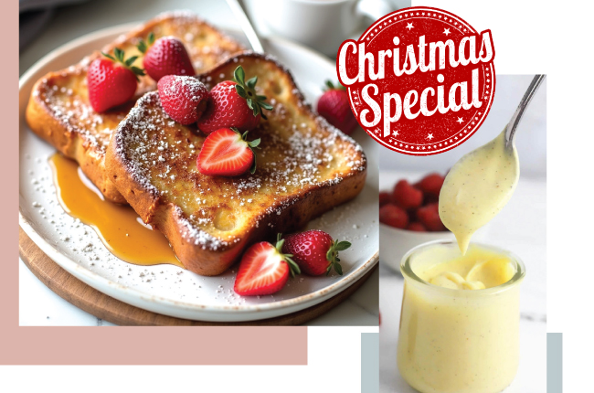මෙලෙස සාදාගත් ප්රංශ ටෝස්ට් එක පිඟානක් මත තබා, උණුසුම් කස්ටඩ් සෝස් ඒ මත වත් කර, පෙති කපන ලද ස්ට්රෝබෙරිවලින් සරසා ගන්න.