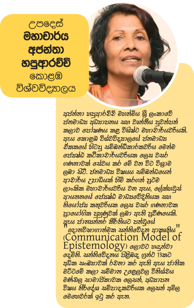 විශේෂයෙන්ම පාසල් විෂය මාලාවට ලිංගික අධ්යාපනය ඇතුළත් කිරීම සම්බන්ධයෙන් වියතුන්, ආගමික නායකයන් සහ කාන්තා සංවිධාන විවිධ මට්ටමේ අදහස් පළ කරති. ඇතැම් පාර්ශ්ව පවසන්නේ මෙය කාලීන අවශ්යතාවක් බවයි. එහෙත් මෙරට ජනමාධ්ය සහ අධ්යාපන ක්ෂේත්රයේ ප්රාමාණික දැනුමක් ඇති මහාචාර්ය අජන්තා හපුඅාරච්චි මහත්මිය මෙම කරුණ සම්බන්ධයෙන් මතු කරන්නේ හාත්පසින්ම වෙනස් වූත් ඉතාමත් තාර්කික වූත් අදහසකි. ඇය පෙන්වා දෙන්නේ ලිංගික අධ්යාපනය යනු හුදෙක් විෂය නිර්දේශයකට කොටු කළ හැකි හෝ ලිංගික කරුණු ප්රසිද්ධියේ සාකච්ඡා කිරීමෙන් පමණක් විසඳිය හැකි ගැටලුවක් නොවන බවයි.