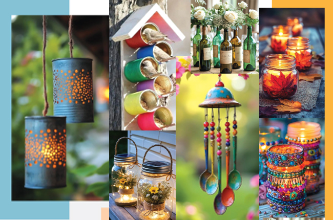 ඔබ මේ දකින්නේ එලෙස සකසාගත් සරල එහෙත් ඉතාමත් දැකුම්කලු නිර්මාණ කිහිපයකි. මේ සඳහා යොදාගෙන ඇත්තේ භාවිතයෙන් ඉවතලන විවිධ හැඩයේ, විවිධ ප්රමාණයේ හිස් බෝතල්, ටින් සහ හැඳි කිහිපයක් පමණි. විශේෂයෙන්ම මුළුතැන්ගෙයින් ඉවතලන දේවල් අතරේ ඇති මෙවැනි නොදිරන හිස් බඳුන් බොහෝ දෙනකුට මහත් හිසරදයක් බව නොරහසකි. ඒවායින් මෙලෙස නිවෙස සහ ගෙවත්ත සරසන හරි අපූරු නිර්මාණ බවට පත් කරගන්නට හැකිනම් එය කදිම ආයෝජනයකි.