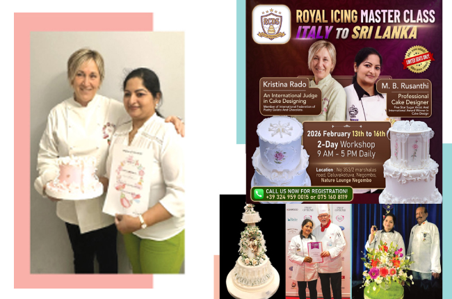 Royal Icing Master Class Italy To Sri Lanka නමින් පෙබරවාරි මස 13 සිට 16 ( මෙම දින අතරින් ඔබට පහසු දින දෙකක් තෝරාගත හැකියි.) පෙ.ව 9:00 සිට ප.ව 5:00 දක්වා මීගමුව Nature Lounge හි පෙබරවාරි 13,14 (නො.353/2, මාෂල් පාර දළුවකොටුව) හි පෙබරවාරි 15,16 පන්නිපිටියේදීත් පැවැත්වේ.