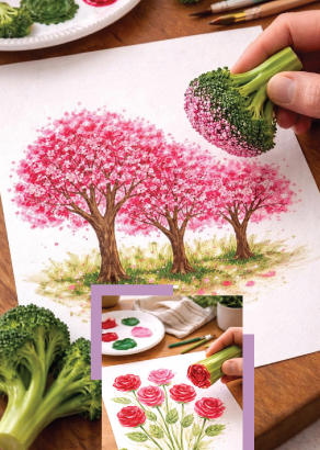 බ්රොකොලි කැබැල්ලක මතුපිට ඇති කුඩා පොකුරු ස්වභාවය නිසා, එය තීන්තේ ගිල්වා කඩදාසියක තැබූ විට ගසක අතු පතර ඇති කුඩා කොළ හෝ මල් පොකුරු (චෙරි බ්ලොසම් ගස්) නිර්මාණය කිරීමට කදිමය.