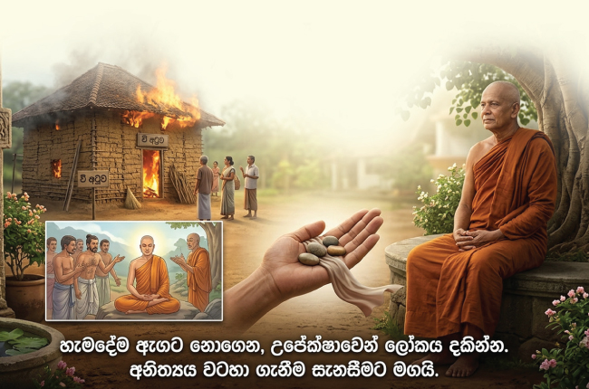 සිටුවරයා පැවසුවේ, “ස්වාමීනි, මා මෙතෙක් කල් මේ සම්පත් මගේ කියා සිතාගෙන සිටියා. නමුත් අද මේවා ගිනිගෙන විනාශ වෙද්දී මට වැටහුණා මේ කිසිවක් මගේ නොවන බව. ඒ නිදහස නිසා මගේ සිතට මහත් සැනසීමක් දැනෙනවා” යනුවෙනි. අපට යමක් අහිමි වන විට එය “ඇඟට නොගෙන”, එය ලෝක ස්වභාවය ලෙස දැකීමට හැකි නම් මානසිකව වැටෙන්නේ නැත.