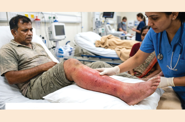 ත වැටිලා, හුස්ම ගැනීම වේගවත් වෙලා. ඔහුගේ දකුණු කකුල දණහිසට පහළින් සම්පූර්ණයෙන්ම ඉදිමිලා, තද රතු පාට වෙලා, අත තියන්න බැරි තරමට ගිනි ගහන රස්නෙයි.